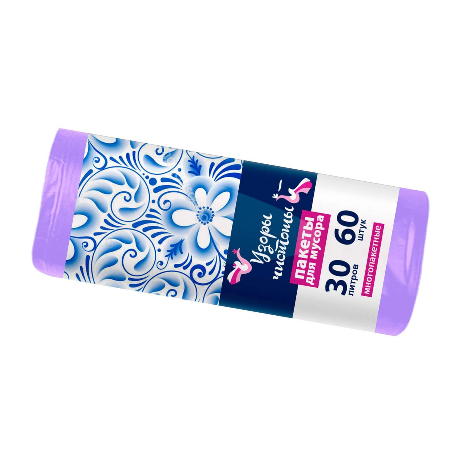 Сиреневые мешки для мусора 'Узоры Чистоты' - яркое решение для вашего дома! Этот удобный набор включает в себя 60 мешочков объемом 30 литров каждый. Они предназначены для эффективного сбора и утилизации различных отходов.