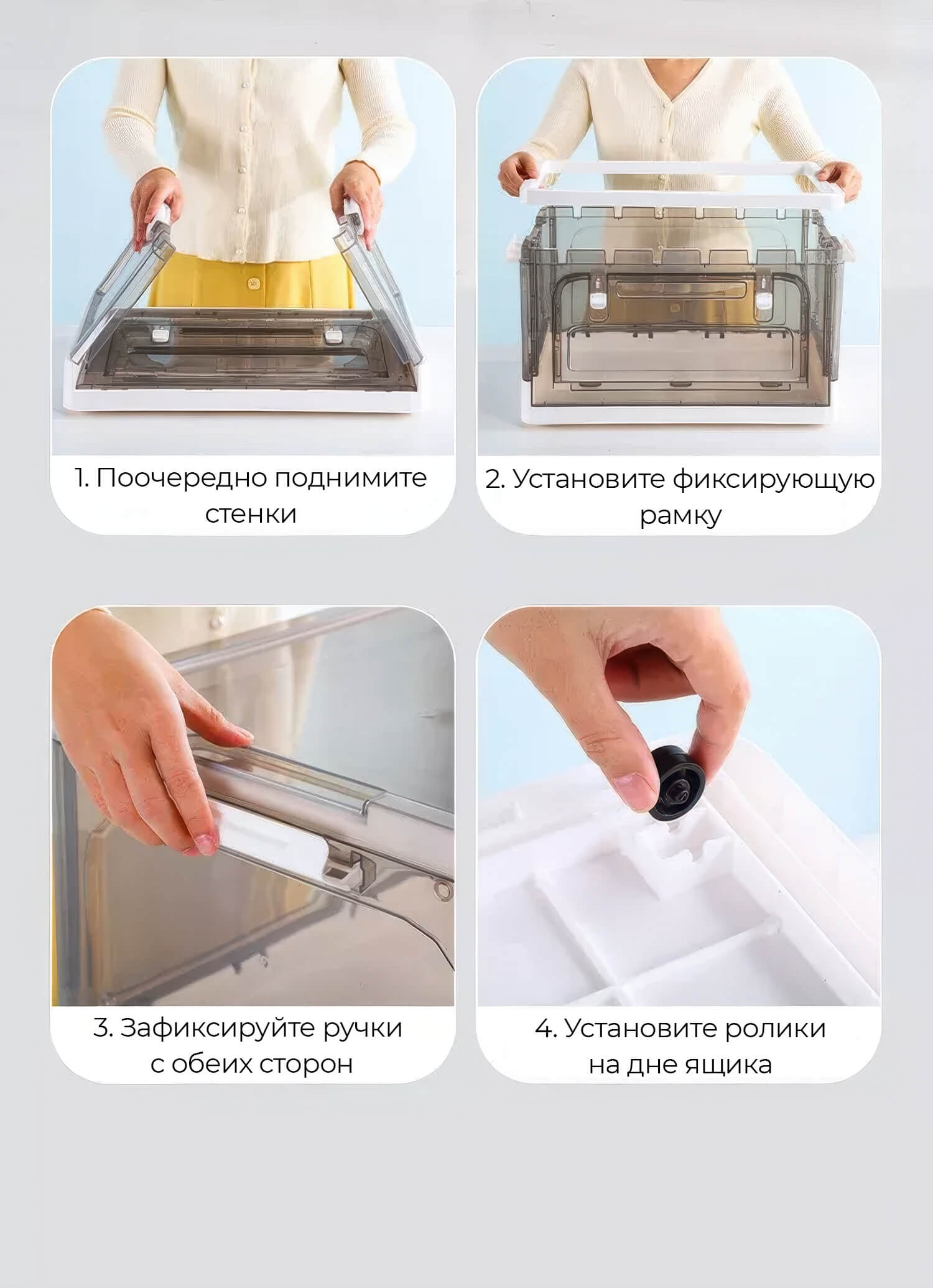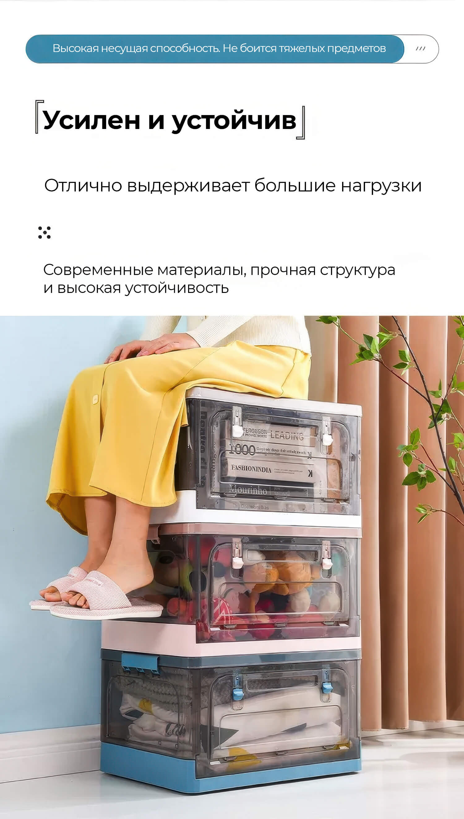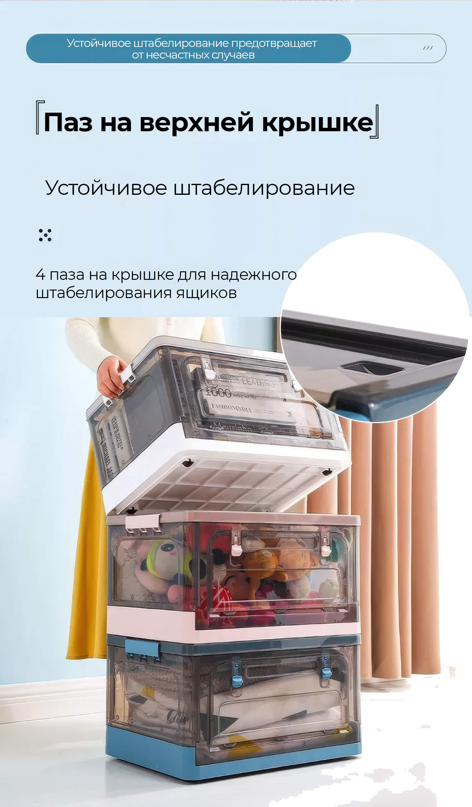 Пластиковая коробка с крышкой надежно защищает вещи от пыли и влаги, сохраняя их в чистоте. Прочная конструкция выдерживает ежедневные нагрузки, а складной механизм позволяет компактно хранить ящик, когда он не используется.