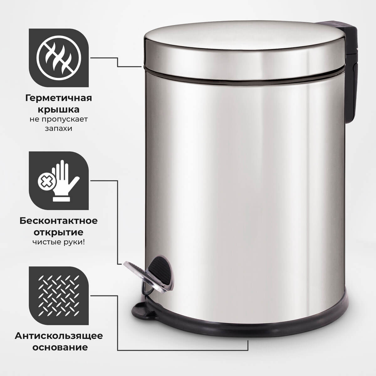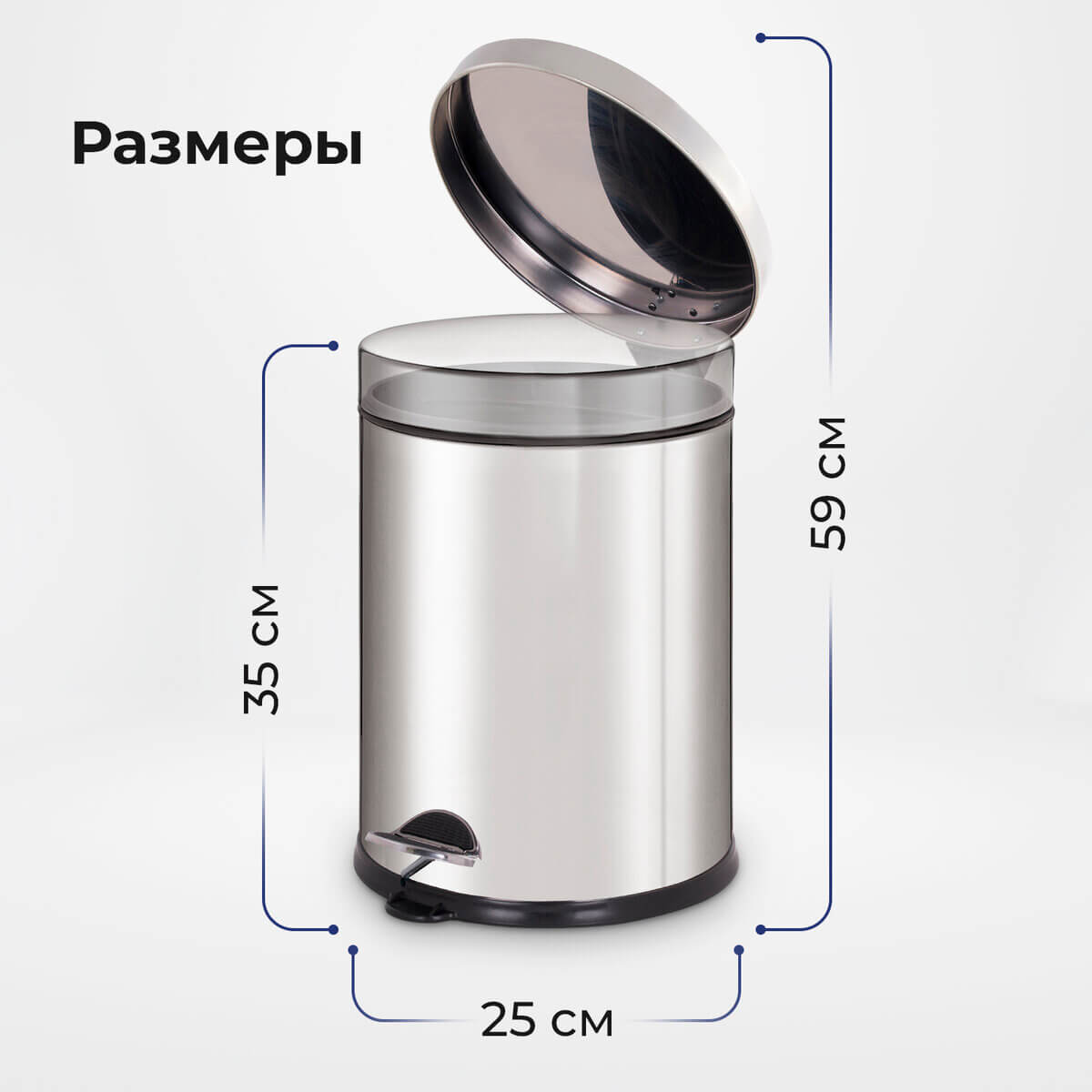 Изготовленное из нержавеющей стали с антикоррозийным покрытием, ведро гарантирует долгий срок службы. Антискользящее основание придает устойчивость. Рекомендуемый объем мешка - 20 литров.